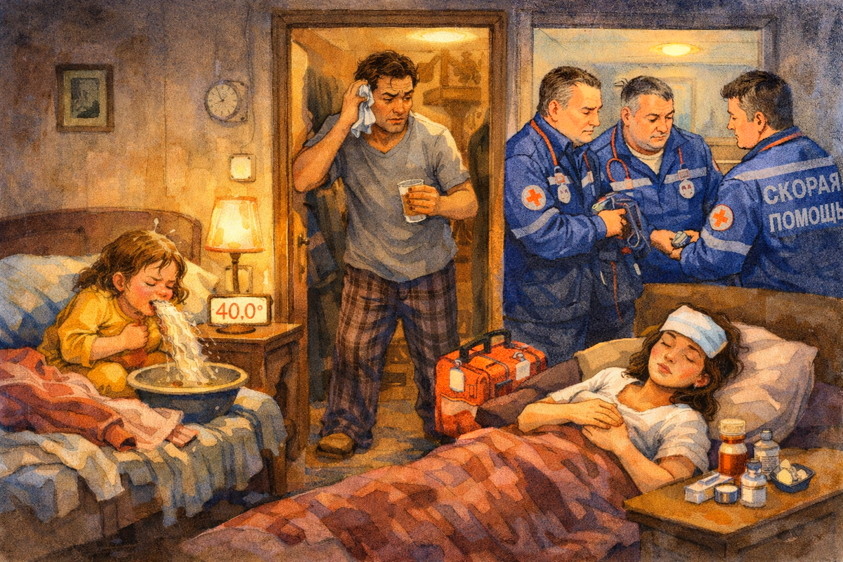 Мне было лет пять, может шесть. Я этого толком и не помню — мне потом папа рассказывал. Много раз и всегда одинаково, все время качая головой: «Цирк у нас был, а не семья.» Начиналось всегда одинаково. Я просыпалась ночью горячая, как печка. Лоб — ладонь не удержишь. Мама хваталась за градусник — тридцать девять и пять. Давала сироп. Через полчаса мерила снова — тридцать девять и восемь. Обтирала мокрым полотенцем. Свечку ставила. Снова мерила — сорок. Температура не падала. Она вообще ни на что не реагировала, как будто назло. А потом начиналось то, чего мама выдержать не могла. Меня рвало. Не просто тошнило, а фонтаном, прямо как в том самом страшном кино. Мама говорила: «Я не понимала, как в таком маленьком человеке столько всего помещается.» Я ревела, мама ревела, простыни мокрые, пижама мокрая, всё вокруг мокрое... И вот тут у мамы начиналось своё. Она видела, как я мучаюсь, и ей становилось плохо. По-настоящему плохо. Не «ой, нервничаю», а бледнела, руки тряслись, давление падал