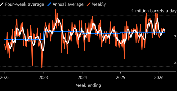 Однако, для увеличения экспорта нефти из РФ есть и ряд преград. Белым - средний четырехнедельный объем морского экспорта нефти из РФ, оранжевым – аналогичный недельный показатель, синим – годовой. Данные и источник: Bloomberg Россия может извлечь выгоду из роста цен на нефть и возможного возвращения спроса со стороны индийских покупателей, пишет Bloomberg. Однако сложная ледовая обстановка на Балтике и украинская атака на главный черноморский порт России могут затруднить экспорт нефти. На неделе до 1 марта средний четырехнедельный объем морского экспорта нефти из РФ составил 3,41 млн б/д, пишет Bloomberg со ссылкой на данные по движению судов. Это чуть меньше показателя предыдущего отчетного периода на уровне 3,44 млн б/д. Более волатильные недельные данные показали снижение показателя на 90 тыс. б/д до 3,36 млн б/д. Фактическое закрытие Ормузского пролива лишило Индию поставок нефти с Ближнего Востока, на которые приходится около половины всего импорта черного золота в страну. По инфо