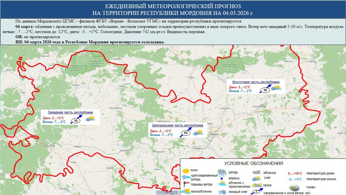 ☁️⛅⛈️ 4 марта в Мордовии облачная с прояснениями погода, небольшие, местами умеренные осадки преимущественно в виде мокрого снега