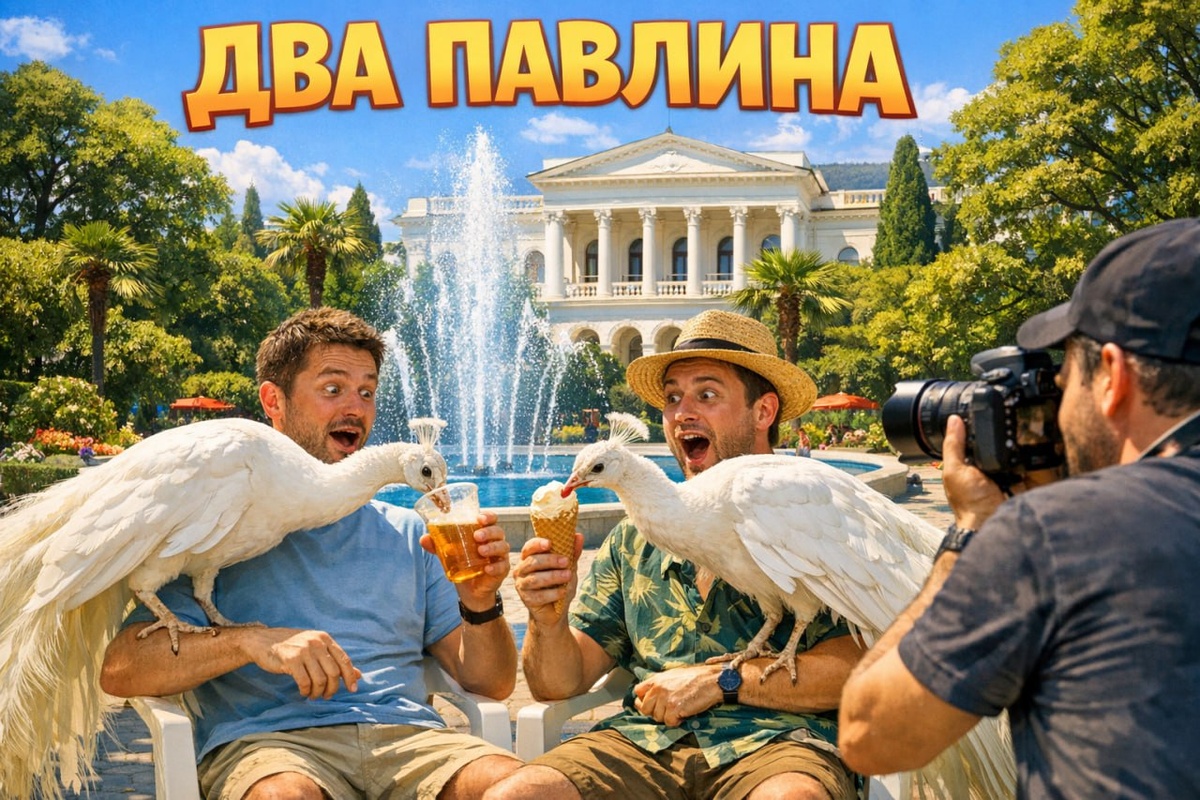 Через некоторое время мы уже вальяжно прогуливались по крымскому оазису, наслаждаясь диковинными видами лесопарка. По асфальтированной дорожке мы вышли к ослепительно белому комплексу с колоннадой. На площади, перед которой разлёгся фонтан. Как мне показалось, с голубой, искрящейся на солнце водой. С лева от фонтана, стояли два белых пластиковых кресла, а за ними прохаживался местный фотограф. Около портретиста, чинно прогуливались два белых павлина с длинными хвостами.