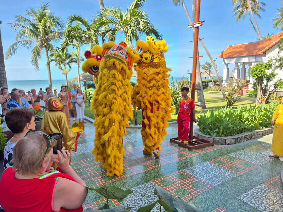 Утро нового года китайского началось во Вьетнаме! В дверь ломились местные ряженные. Несколько человек в костюмах львов бегали по отелю, тормошили постояльцев под звуки огромных барабанов. На столбах, пальмах и под потолком ресторанов были заранее развешаны конверты с деньгами. Их то и пытались добыть артисты в перерывах между плясками.