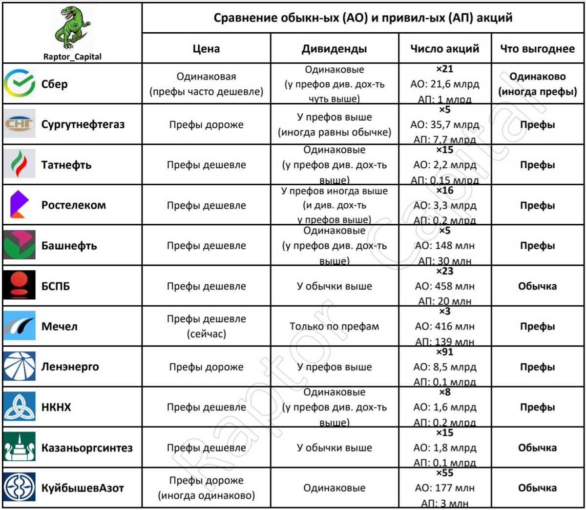 📌 Многие инвесторы привыкли покупать обыкновенные акции компаний, хотя привилегированные иногда более выгодны. Сравнил два типа акций у некоторых компаний. • В большинстве случаев префы стоят дешевле и див. доходность у них выше, чем у обычных акций. Префов всегда меньше, чем обычных акций, поэтому ликвидность у префов ниже (крупные покупки/продажи сильнее влияют на цену). • Другие различия двух видов акций менее значительны: 1) У обычных акций формально есть право голоса, правда для этого нужно владеть акциями на несколько млрд рублей; 2) При ликвидации компании держатели префов получают больше денег, чем владельцы обычных акций (у Татнефти эта разница всего 1 рубль на акцию); 3) В случае поглощения компании есть шанс, что у держателей обычных акций получится заработать на оферте (выкуп Башнефти в 2016 году на 24% дороже рыночной цены). • Сейчас более 50 компаний имеют префы, в таблицу отобрал 11 наиболее ликвидных, чтобы сравнить, какой тип акций выгоднее. 1️⃣ Сбер • У префов и обыч