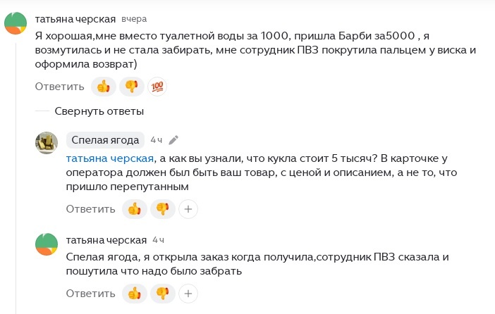 Публикация по следам последних комментариев под одной из статей про Авито. Ситуация у читательницы сложилась следующая: она заказала на Авито туалетную воду за 1000 рублей. Когда пришла получать их на пункт выдачи, в посылке вместо туалетной воды оказалась кукла Барби стоимостью 5000 рублей. Покупательница решила, что нужно оставаться честной до конца - и отказалась от посылки, потому что получила не то, что заказывала. Даже несмотря на то, что она была бы определенно в плюсе, если забрала бы куклу, которая дороже ее туалетной воды в 5 раз. Объясняю, почему логичнее (и правильнее) было бы забрать куклу. Начну с того, почему и как вообще такое могло произойти. Вариантов несколько. 1. При приеме посылки оператор перепутал наклейки, приклеил штрихкод не на ту коробку. Такое бывает, когда очередь, оператор торопится и одновременно обслуживает несколько человек. Именно поэтому на наших пунктах обслуживание Авито осуществляется строго по очереди, а не несколько человек сразу. 2. Продаве