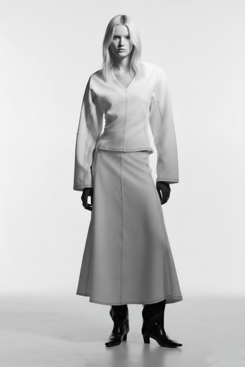 В прошлой статье мы разобрали моделирование этой юбки с расширением нижнего среза за счет клиньев на бумажной выкройке.
