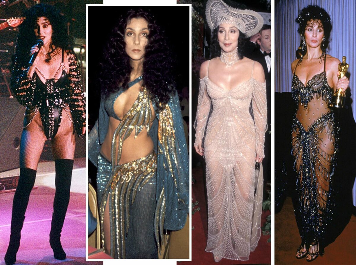 Ее стиль невозможно спутать ни с чьим другим. Длинные прямые черные волосы, обнаженное тело, прикрытое лишь кружевом или стразами, немыслимые головные уборы, экстремальные декольте, прозрачные ткани — Шер довела эпатаж до уровня высокого искусства.