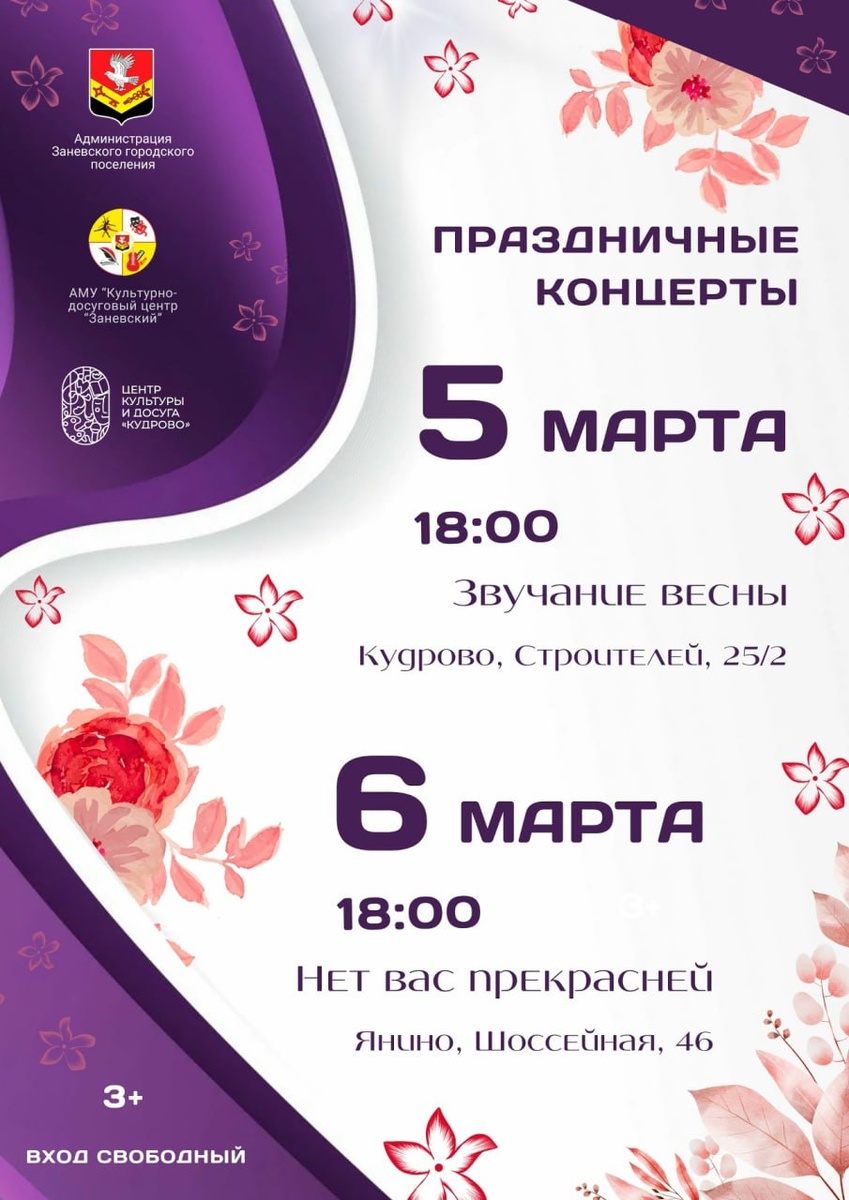 ! 🎉Администрация Заневского городского поселения приглашает вас на торжественные концерты, посвященные самому ласковому весеннему празднику. Для любимых мам, сестёр и бабушек выступят талантливые воспитанники муниципальных домов культуры. 💐В программе мероприятий: искренние поздравления, исполнение любимых песен, яркие хореографические номера и трогательные сценические зарисовки. 🤗В АМУ "Центр культуры и досуга "Кудрово" милых дам поздравим 5 марта в 18:00. 📍Кудрово, Строителей, 25/2, большой концертный зал В библиотеке по адресу: д. Заневка, д. 48 программа состоится 4 марта в 17.00 часов. Вход на мероприятия свободный. ✨Милые дамы, подарите себе вечер, наполненный улыбками и вдохновением! Пресс-служба Заневки 🌇 Жизнь в Кудрово ( ВК | Max ) Есть новости? Пишите сюда.