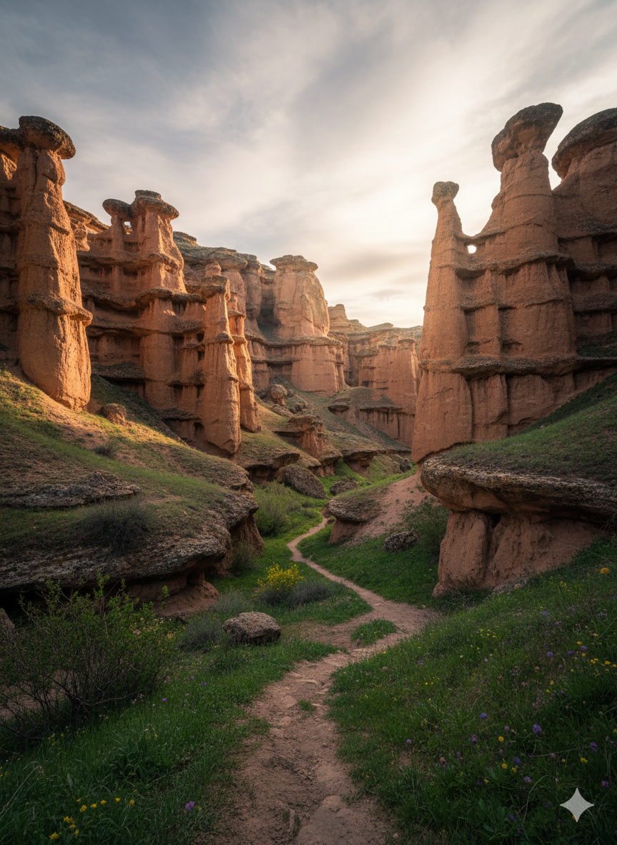 Чарынский каньон — природное чудо, которое нередко сравнивают с американским Гранд-Каньоном. Красные скалы причудливой формы, уходящие вниз на сотни метров, и бирюзовая река на дне — это зрелище запоминается навсегда. Апрель считается лучшим временем для посещения: природа только расцветает, жары ещё нет, а краски каньона особенно насыщены.