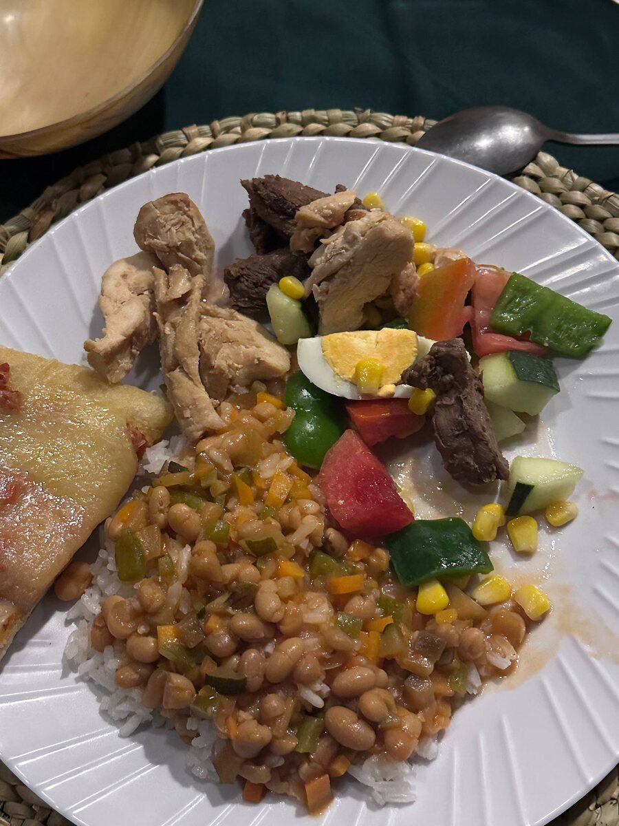 Пример нашего питания на обед/ужин🥣 Тут у нас борщ, пицца, рис, бобовые, мясо, курица, овощи, а на десерт фрукты! Как вам меню