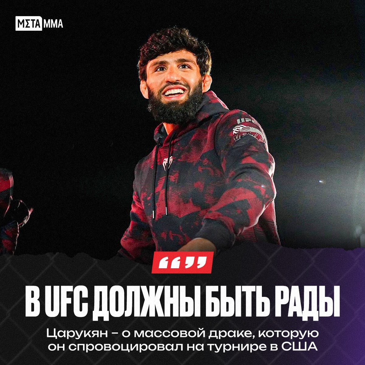 » Второй номер рейтинга лёгкого дивизиона UFC Арман Царукян прокомментировал потасовку с блогером Джорджио Пулласом на турнире по вольной борьбе RAF 6 в Темпе. После победы со счётом 5:3 россиянин ударил соперника, что спровоцировало массовую драку. «Это не моя вина! Сейчас все на моей стороне! Я терпел, когда он шесть минут меня пинал. Чего вы от меня ждали? В UFC должны быть рады, что боец из их лиги не позволяет никому себя избить. Боец номер один UFC участвует в турнире по борьбе, побеждает борца вольного стиля, а потом показывает уровень UFC», – сказал Царукян в интервью Ариэлю Хельвани. ❓Как вы думаете — поощряет ли UFC активность Армана? 🔥 — Думаю, что да 🤔 — Наверное, они в шоке 👊 Подпишись на Meta MMA | Meta MMA в MAX | Наш канал в ВК