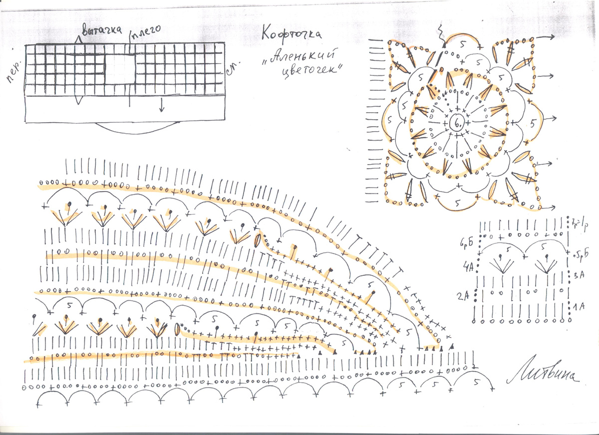 Для вязания кофточки "Аленький цветочек" вам потребуется 250 - 300 гр. хлопчатобумажных ниток "Ирис", "Анна", "Ажурная", "Роза" 560 - 600 м/ 100 гр., 50 гр. отделочных ниток.