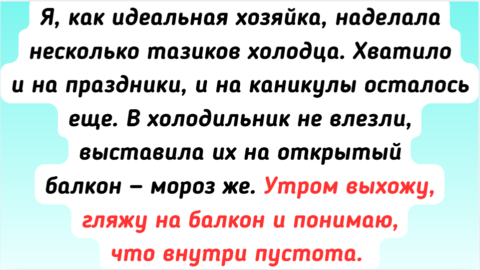 - Я, как идеальная хозяйка, наделала несколько тазиков холодца. Хватило и на праздники, и на каникулы осталось еще. В холодильник не влезли, выставила их на открытый балкон — мороз же. Утром выхожу, гляжу на балкон и понимаю, что внутри пустота. А внизу, на дереве, сидит стая ворон, которые лениво каркают и выглядят подозрительно довольными. Они за ночь перетаскали стратегический запас еды на всю неделю! Пришлось брать магазинный.