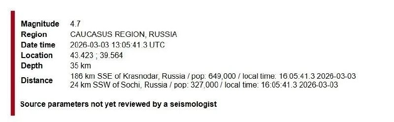 Мониторинг зафиксировал землетрясение магнитудой 4,4–4,7 в Чёрном море, недалеко от Сочи. Толчки могли быть ощутимы в Центральном районе, Мацесте, Хосте и Адлере. Информации о разрушениях и пострадавших нет. Сейчас всё спокойно. Черноморское побережье — сейсмоактивная зона, поэтому подобные толчки здесь не редкость и обычно не приводят к серьёзным последствиям. https://max.ru/id2372001505_gos https://ok.ru/group/70000041523919 https://vk.com/public212083585 https://dzen.ru/id/660af8bc3bd95d5b99e56429 - подпишись на СВОй "Рассвет".