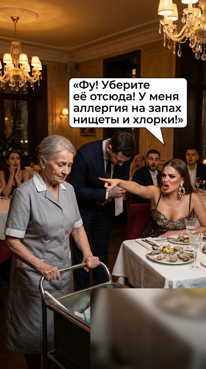 Анна Николаевна подрабатывала уборщицей в дорогом ресторане. Платили хорошо, а деньги были нужны — они с мужем строили дом, и каждая копейка была на счету. Работа не грязная: так, протереть пол, если кто-то что-то уронил. В тот вечер за угловой столик села молодая, вульгарно одетая дамочка. Она щелкала пальцами, подзывая официантов, и кривила губы от меню. Когда Анна Николаевна проходила мимо с тележкой, дамочка вдруг взвизгнула: — Фу! Уберите её отсюда! У меня аллергия на запах нищеты и хлорки! Как я могу есть устрицы, когда тут шваброй машут? Подошел менеджер, начал стелиться перед клиенткой и попросил Анну Николаевну уйти в подсобку. Дамочка торжествовала. А через десять минут в ресторан зашел высокий мужчина в дорогом пальто. Дамочка аж подскочила — это был тот самый "папик", который спонсировал её роскошную жизнь и к которому она так долго набивалась в официальные невесты. Мужчина окинул взглядом зал, подошел к подсобке, вывел оттуда Анну Николаевну и... поцеловал её. — Ну что, Ан