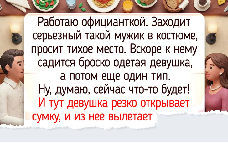 - Работаю официанткой. Заходит серьезный такой мужик в костюме, просит тихое место. Вскоре к нему садится броско одетая девушка, а потом еще один тип. Ну, думаю, сейчас что-то будет! И тут девушка резко открывает сумку, и из нее вылетает воздушный шарик. Парень с девушкой кричат: «С днем рождения, папа!» Мужик в костюме мгновенно превращается в милого котика, я понимаю, что это не любовный треугольник. Оказывается, они год не общались и, наконец, помирились и решили встретиться.