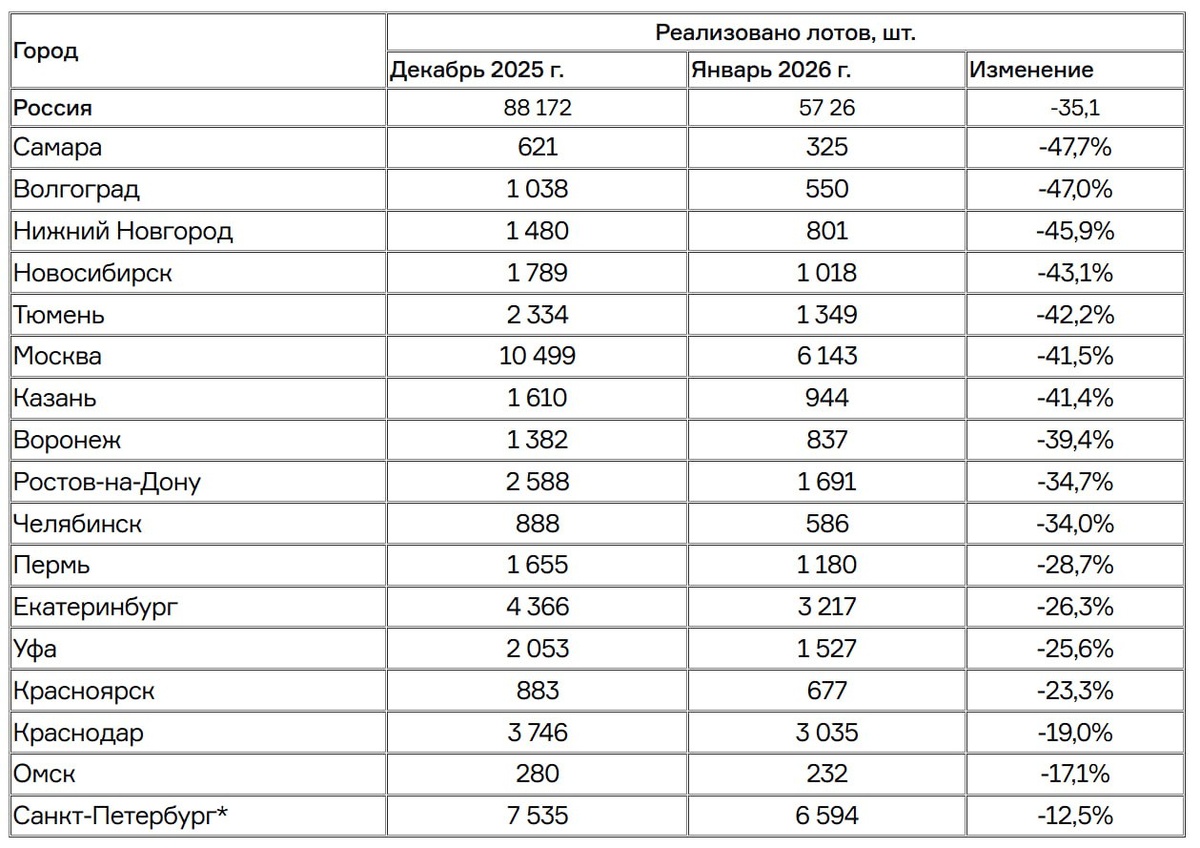 В январе было реализовано всего 57,3 тыс. квартир против 88,2 тыс. в декабре, когда рынок показал самые рекордные результаты за всю историю. ⬇️Сильнее всего продажи просели: 🔵Самара — 47,7%; 🔵Волгоград — 47%; 🔵Нижний Новгород — 46%; 🔵Новосибирск — 43%; 🔵Москва — 41,5%; 🔵Казань — 41,4%.