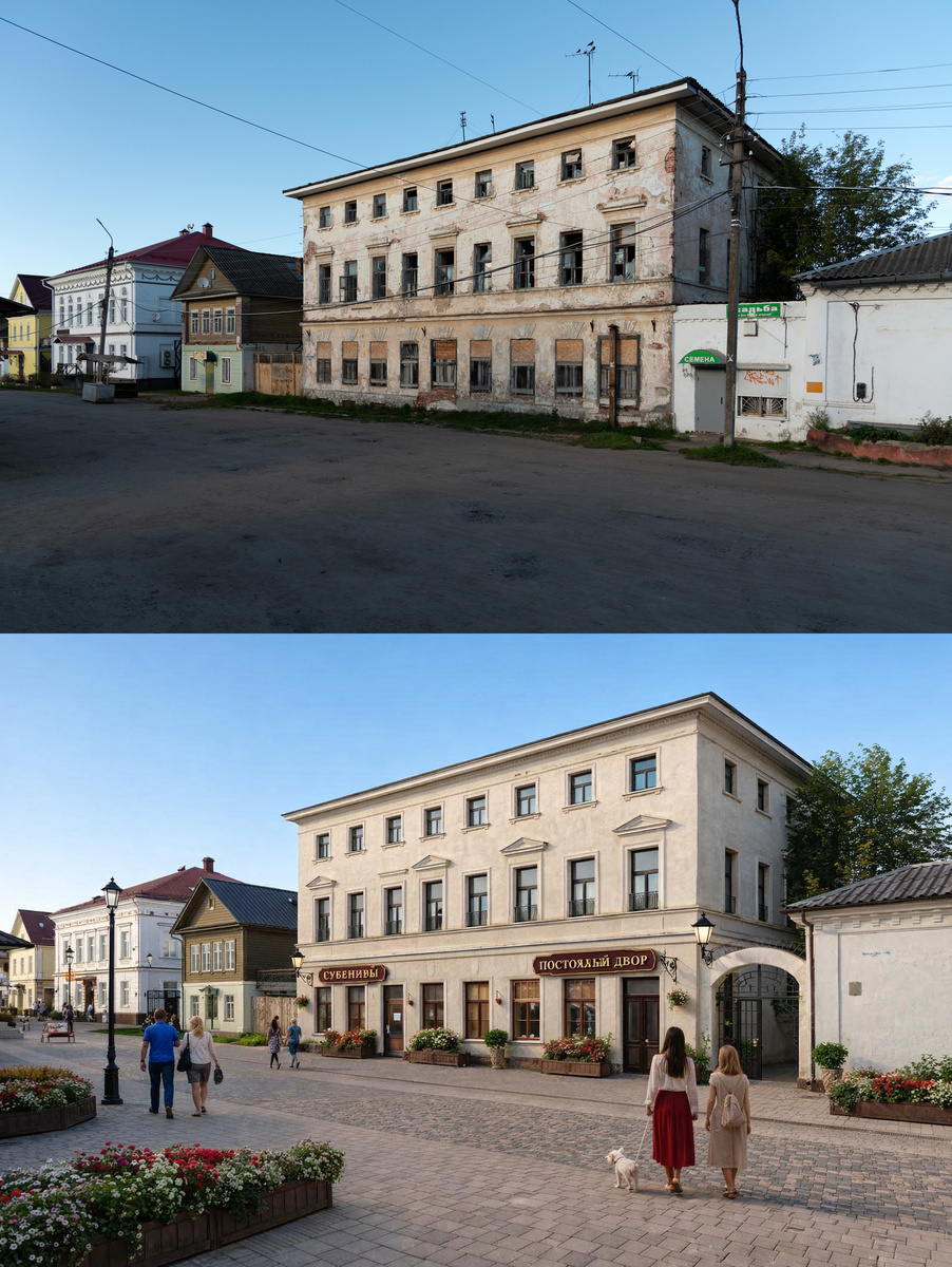 Снимки представлены в формате было/стало: сверху – реальная фотография, снизу – изображенние, сгенерированное на ее основе с помощью ИИ. Генерация изображений отреставрированных зданий была выполнена с помощью сервиса Syntx AI. Все фотографии были сделаны мной за последние несколько лет.