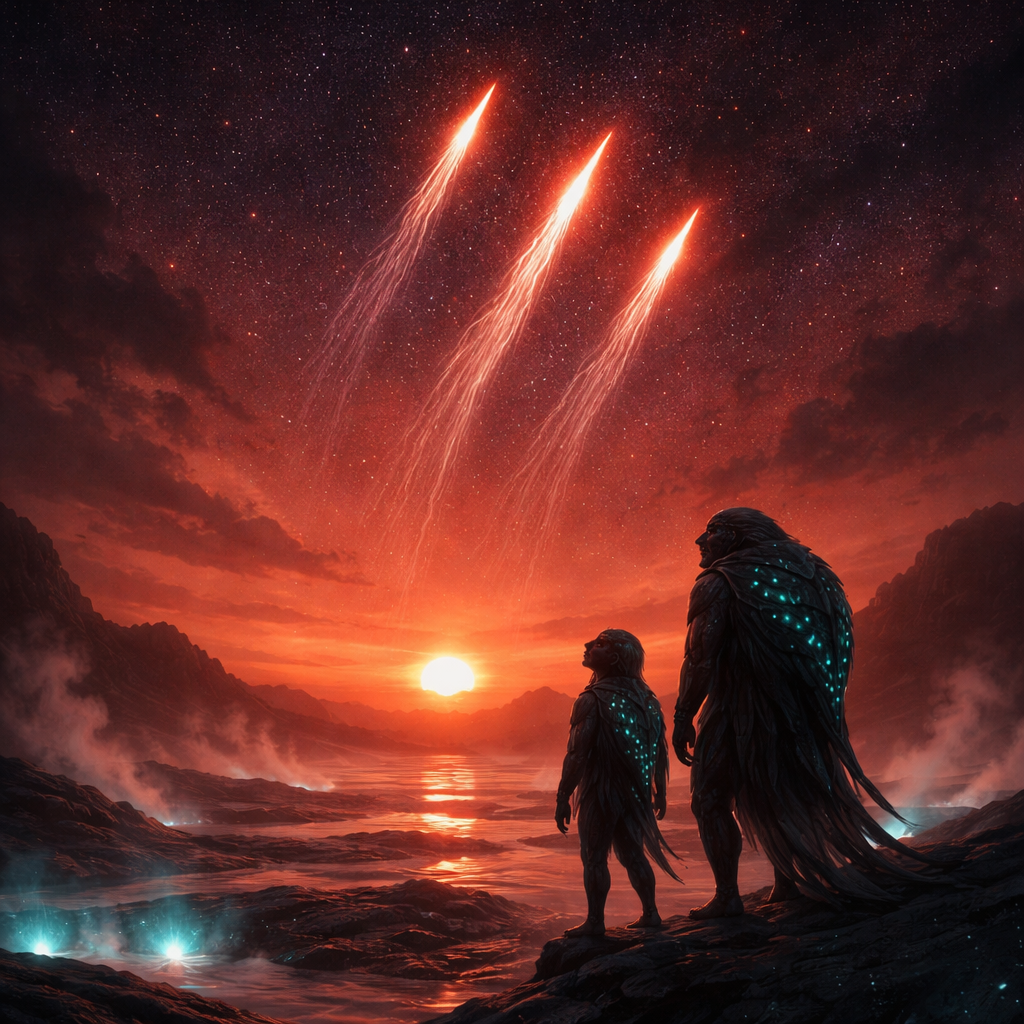 Кормчий встряхнулся, пятна и блики пришли в движение, образовав подобие не то фигуры, не то символа. Своеобразный отпечаток того, что целую эпоху тому назад одно поколение наблюдало над своей колыбелью. Три ярких кометных обломка, обращённых хвостами вверх.