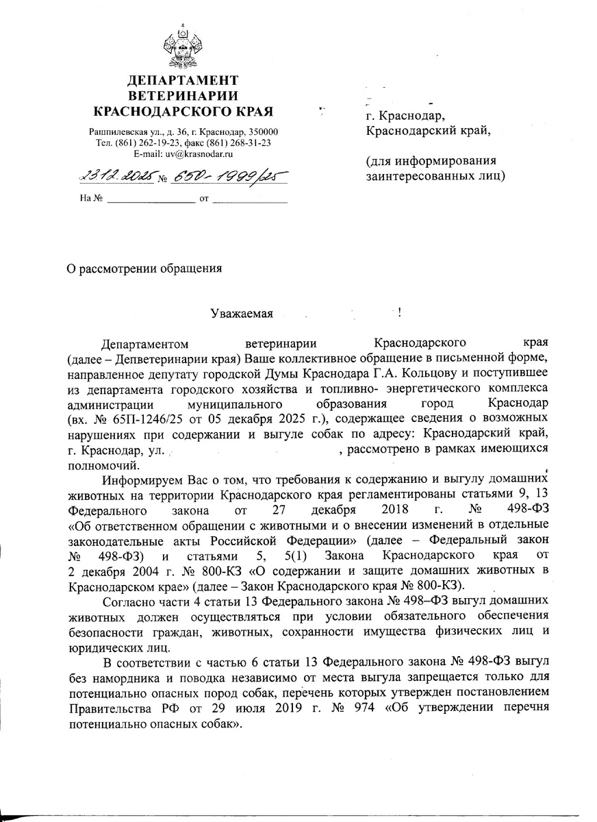Ранее я уже публиковал материал о том, что в одном из МКД на Гидрострое в г. Краснодаре, где у меня живут родственники, проживает неадекватная собачница, которая содержит в квартире только по официальным данным 6 собак. На самом деле соседи предполагают, что собачница занимается бизнесом по передержке собак. Запах в подъезде - ни с чем не сравнимый. Выводит она гулять эту свору, по большей части, без поводков, и, естественно, без намордников. В своре есть собака бойцовской породы. Повстречаться с такой сворой на узкой лестничной клетке - еще то удовольствие (по собственному опыту знаю). Весной прошлого года я подавал на эту собачницу заявление в Департамент ветеринарии Краснодарского края. И был приятно удивлен, что получил не отписку, а департамент запросил в прокуратуре края разрешение на проверку, провел проверку и привлек собачницу к административной ответственности. Но, этого оказалось мало, и, как говорят соседи, свора собак, принадлежащих этому персонажу, загрызла кошку во дворе