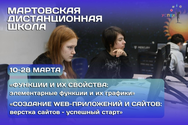 Региональный центр выявления и поддержки одаренных детей «Успех» приглашает обучающихся 6–11 классов Курской области стать участниками дистанционной школы, которая пройдет с 10 по 28 марта. Школьники могут выбрать любую понравившуюся программу и зарегистрироваться на нее в АИС «Навигатор дополнительного образования» до 9 марта: ✅«Функции и их свойства: элементарные функции и их графики» (10-11 класс). Участники разберутся в многообразии функций, научатся исследовать их характеристики: clck.ru/3S5SWK ✅«Создание WEB-приложений и сайтов: верстка сайтов – успешный старт» создана для тех, кто мечтает научиться строить веб-пространство своими руками: clck.ru/3S5ScK Расписание занятий и ссылка для входа на образовательную платформу будут направлены обучающимся после регистрации на программы.