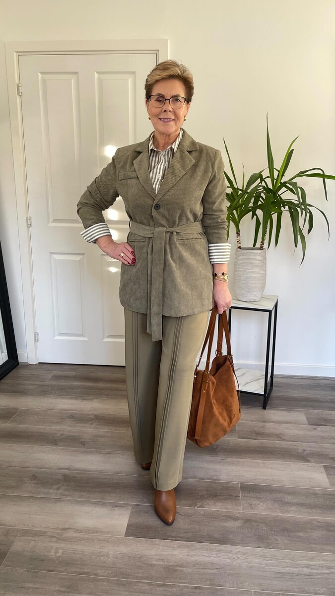 Истинная элегантность не знает границ, и наша героиня, которой уже за 65, является ярким тому подтверждением. Её образы аккуратные, без броских украшений, построенные на гармоничном сочетании классики, актуальных трендов и безупречного вкуса. Ниже собрала 10 её образов для вашего вдохновения. Идеальный вариант для деловых встреч и прогулок. Брюки со стрелками и пиджак с поясом создают стройный силуэт, а рубашка в бело-оливковую полоску добавляет свежести и легкости. Коричневые замшевые ботильоны и сумка гармонично дополняют ансамбль, подчеркивая теплую цветовую гамму. Брюки из оливкового костюма наша героиня умело сочетает с нежно-желтым джемпером, создавая нежный и уютный образ. Миниатюрная желтая сумка добавляют ансамблю солнечного настроения. Посмотрите, как брючной костюм бежевого цвета гармонично смотрится с бордовой водолазкой, сумкой и лодочками, создавая дорогой и утонченный вид. Монохромный образ в оттенках бургунди и винного выглядит очень стильно и дорого. Полосатый джемп