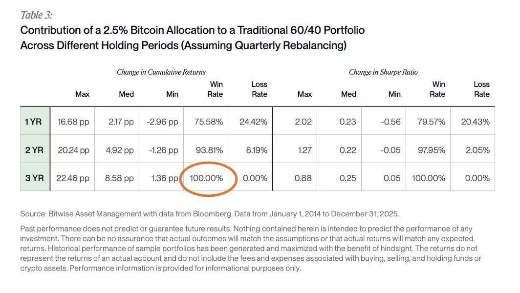 A Bitwise study found that adding Bitcoin to a traditional 60/40 portfolio improved cumulative and risk-adjusted returns in 100% of three-year periods and 93% of two-year periods through year-end 2025.