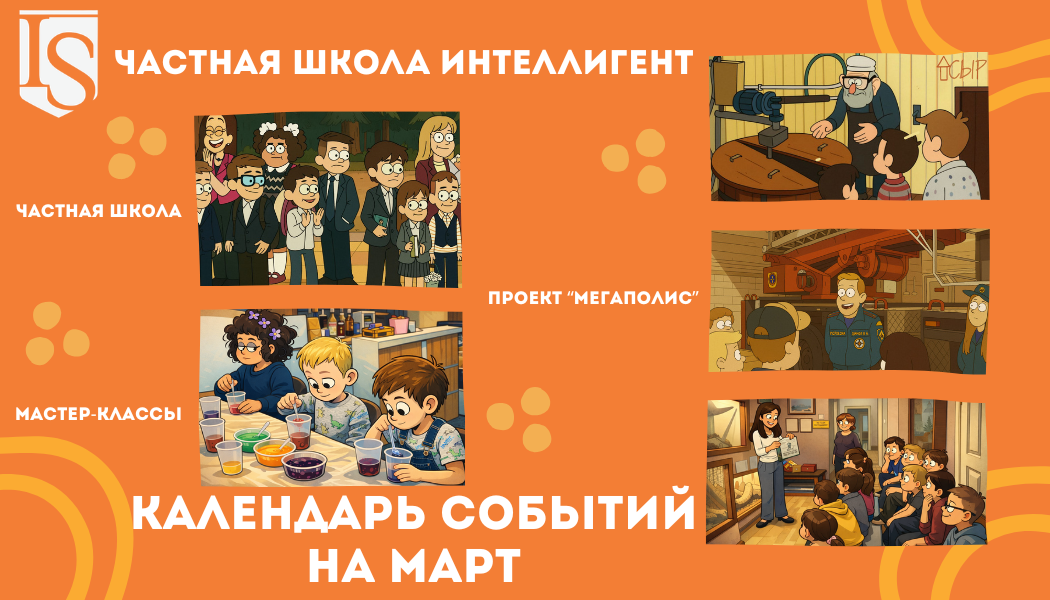 #КалендарьСобытийМегаполис в Частной Школе ИНТЕЛЛИГЕНТ г. Солнечногорск на март 🗓 Март в нашей Школе обещает быть насыщенным! Мы подготовили программу, полную новых знаний и увлекательных поездок в рамках проекта #Мегаполис@ischoolsol. 🗓 Главные события марта 🏫 ЧАСТНАЯ ШКОЛА: ДНИ ОТКРЫТЫХ ДВЕРЕЙ Каждую субботу мы ждем вас, чтобы познакомиться со школой, ответить на вопросы и рассказать о наборе на 2025/2026 и 2026/2027 учебные годы. 📌 7 и 21 марта (субботы), 11:00 ДЕНЬ ОТКРЫТЫХ ДВЕРЕЙ в Частной Школе 📌 14 и 28 марта (субботы), 11:00 ДЕНЬ ОТКРЫТЫХ ДВЕРЕЙ, посвященные Летнему Лагерю 🎉 ВНУТРЕННИЕ МЕРОПРИЯТИЯ ШКОЛЫ События для наших учеников, которые делают школьную жизнь ярче: 📌 10 и 11 марта Посещение художественного салона «Эскиз»: знакомство с профессией художника 📌 17 марта (вторник) Посещение ДК «Выстрел»: концертная программа и кинопоказ фильма «Крым» 📌 18 марта (среда) Открытый урок, посвященный Дню Добрых Дел 📌 23 марта (понедельник) Краеведческий час «Край, в котором я