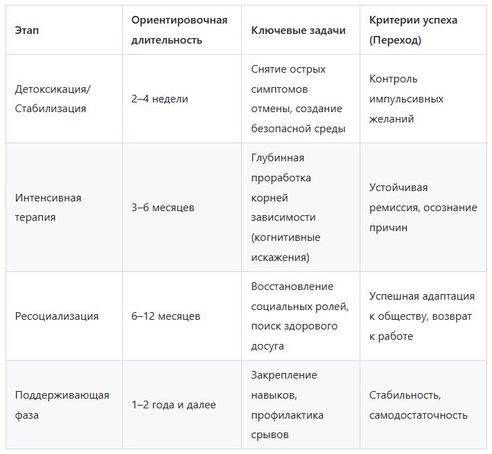 Ключевые этапы реабилитации охватывают физиологическое очищение, глубокую психологическую перестройку, социальную адаптацию и долгосрочную профилактику.
