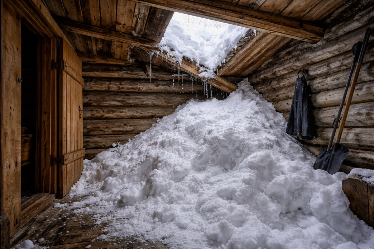 Ночью я слышал глухие удары по крыше. Сначала подумал — обычный мокрый снег, тяжёлый, липкий. Он ложится слоями, накапливается, давит. Такое бывает каждую зиму. Но один удар был другим. Не скольжение, не осыпание — именно глухой провал. Я проснулся, прислушался. Печь трещала ровно, ветер стих. Больше звуков не было. Решил, что утром проверю крышу. Когда я открыл дверь в сени, холод ударил в лицо сильнее обычного. И я сразу увидел белое. Сугроб начинался прямо от порога. Снег лежал внутри, неровной кучей, почти по колено. Сквозь пролом в потолке виднелось серое небо. Часть перекрытия в сенях не выдержала. Мокрый снег тяжёлый — в несколько раз тяжелее сухого. А сени я не топлю, там температура ниже, и снег на крыше тает медленнее, образуя плотную массу. Балка дала трещину. Доски проломились. Первое — я закрыл дверь в жилую часть избы, чтобы не пустить холод дальше. Потом осторожно вошёл в сени, проверяя пол — не подмыло ли снизу. Доски держали. Снег продолжал медленно осыпаться сверху,