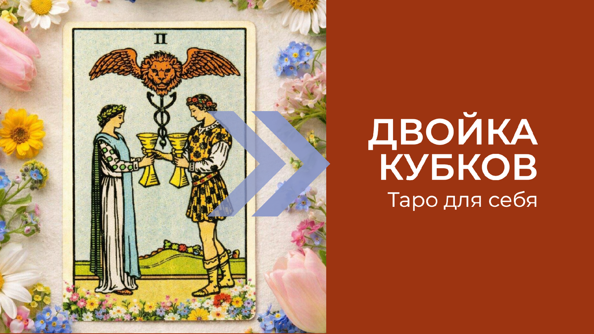 А вот и долгожданная весна! По случаю достаю из колоды Двойку Кубков (или Двойку Чаш, кому как привычнее), одну из самых приятных карт. Наконец-то Аркан про любовь и гармонию. Двойка Кубков в классическом представлении колоды Уэйта изображается как мужчина и женщина, которые обмениваются кубками, скрепляя свой союз под наблюдением крылатого льва. Идиллия, не иначе.