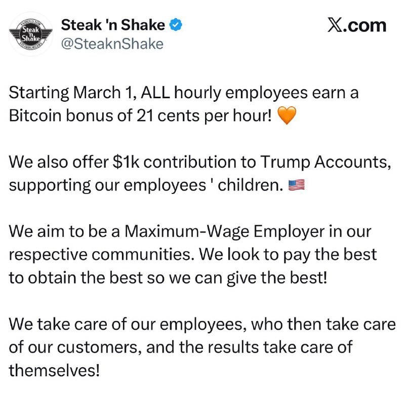 Сеть бургерных решила замотивировать по-криптовому — с 1 марта Steak ’n Shake начисляет сотрудникам бонус в BTC: по $0,21 в биткоине за