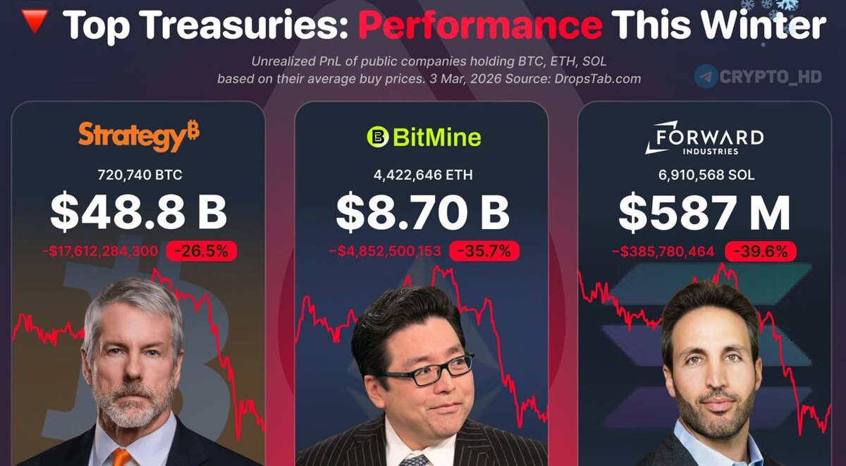 : βͺ#BTC Strategy: -$17,6b (-26,5%). βͺ#ETH Bitmine: -$4,8b (-35,7%). βͺ#SOL Forward Industries: -$385m (-39,6%). Crypto Headlines