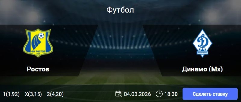 ) Статистика Ростова: Статистика свидетельствует, что обмен голами фиксировался в пяти последних играх клуба в национальном Кубке, а верховой тотал пробивался в шести из восьми домашних встреч. На своем поле команда поражала ворота соперников в шести из восьми недавних матчей этого турнира. Статистика Динамо Мх: На выезде динамовцы не проигрывали по итогам 90 минут в шести из семи случаев, неизменно забивая минимум один гол в восьми гостевых встречах кряду. 🎯 ИТБ2 (0,5) 🎲 кф (1,74) 🎯 X2 🎲 кф (1,85) 🎯 Фора 2 (0) 🎲 кф (2,95) 👉 СДЕЛАТЬ СТАВКУ 🎁 ФРИБЕТ WINLINE - 3000₽ (промокод: BETWIN) 👉 СМОТРЕТЬ ПРОГНОЗ