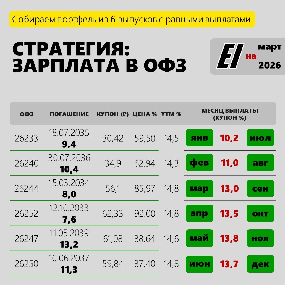 Рынок ОФЗ дает уникальный шанс. Бюджетное правило давит на котировки, Минфин занимает дорого. Для нас это значит одно: распродажа «денежного потока». Вы просили стратегию, чтобы купоны приходили как зарплата — 12 раз в год. Я собрал портфель из 6 выпусков с постоянным купоном (ПД). Но есть математическая ловушка, о которой нужно знать. В подборке есть дисбаланс: 1. «Новички» (Март–Декабрь): Дают на руки ~13.5% годовых живыми деньгами прямо сейчас. 2. «Старички» (Январь–Февраль): Дают на руки ~10.5% (у них ниже купон, но зато выше потенциал роста тела в будущем). Если купить всех бумаг поровну, в январе и феврале ваша «зарплата» просядет на 30%. Решение: Чтобы поток был ровным, в выпуски 26233 и 26240 нужно вложить в 1,3 раза больше денег, чем в остальные. 🔹 Сценарий 1. Капитал 1 000 000 ₽ Распределяем с учетом балансировки. 🔹 Сценарий 2. Капитал 3 000 000 ₽ 🔹 Сценарий 3. Капитал 5 000 000 ₽ Эта стратегия — не «купил и забыл». У нас есть два пути: А какая сумма ежемесячного купона дл