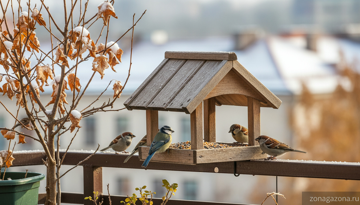 На балконе интересно смотрятся подвесные прозрачные модели. Они позволяют наблюдать за птицей буквально на расстоянии вытянутой руки. Главное — продумать размещение так, чтобы корм не сдувало ветром.