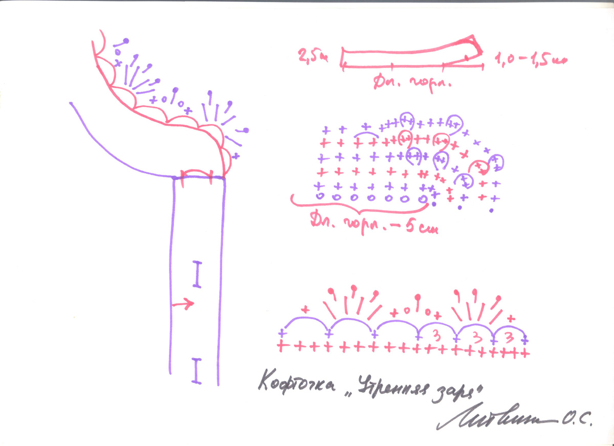 Для вязания кофточки "Утренняя заря" вам потребуется 350 - 400 гр. хлопчатобумажных ниток "Роза", "Ажурная", "Снежинка".