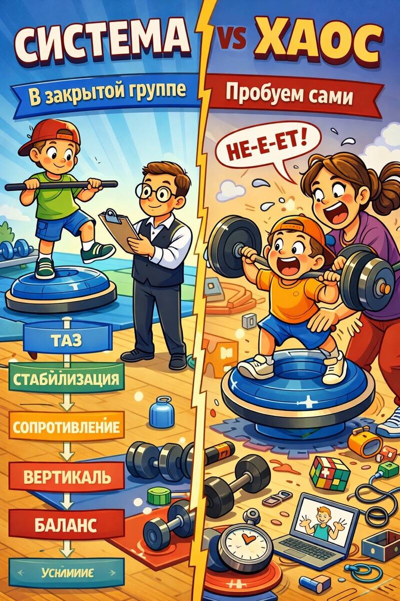 Разбор одного занятия из закрытой группы Часть родителей в этот раз решила «пока не заходить» в закрытую группу. Обычно аргумент один: «Мы и так всё делаем». Можно делать. Вопрос — как? Потому что внутри группы одно занятие выглядит вот так: Система. Логика. Последовательность. Не хаотичные упражнения из интернета. Не «попробуем вот это». А выстроенная работа — от таза к балансу, от сопротивления к произвольности. Разница не в упражнениях. Разница — в мышлении. Инвентарь: BOSU + гимнастическая палка. 1️⃣ Вводная часть Суставная гимнастика Это не просто разминка. Это включение схемы тела и подготовка нервной системы к работе. 2️⃣ Основная часть Начинаем в горизонтали. Подъём таза. Сведение ног через сопротивление. Отведение ног через сопротивление. Выпрямление ног. Сгибание ног лёжа на животе. Что мы делаем на самом деле? — стабилизируем таз — активируем ягодичные — включаем приводящие и отводящие — формируем контроль поясничного отдела Без стабильного таза не будет уст