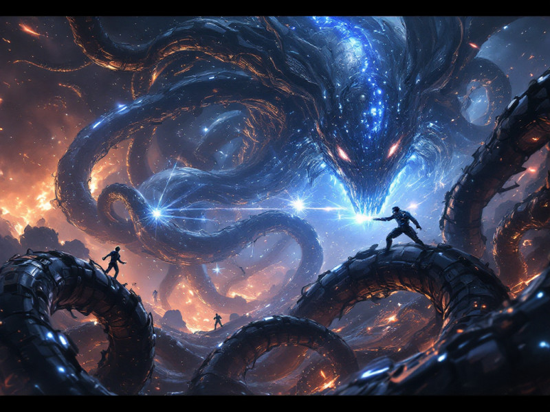 Внезапно щупальца чуждой махины начали обвивать его сильнее. В этот момент его разум наполнился образами: древние битвы, звёздные войны, где машины и существа сражались за право существовать. Тысячи цивилизаций, рождённых и погибших в бесконечном космическом танце, проносились перед его сознанием — калейдоскоп вселенских трагедий и триумфов.