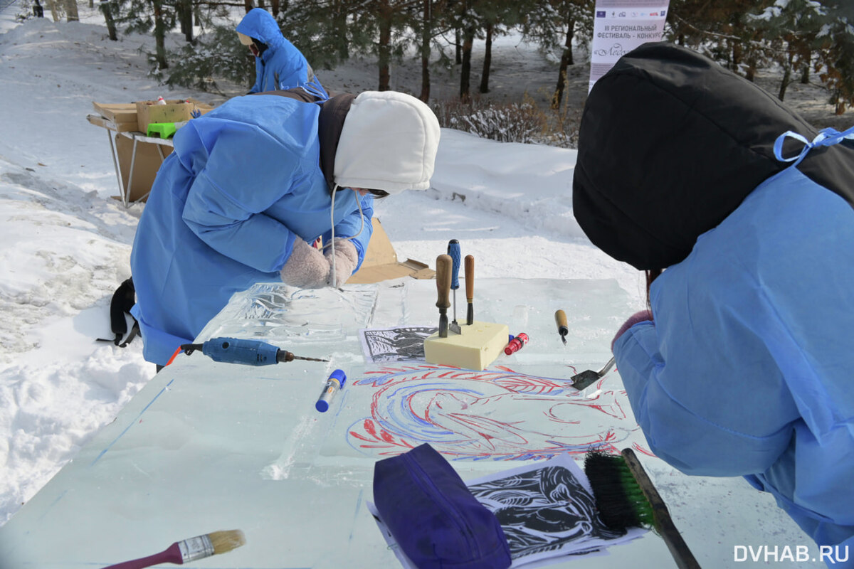 Накануне в Дальневосточном художественном музее наградили победителей конкурса «Ледогравюра», который проходил с 24 февраля на набережной имени Н.Н. Муравьёва-Амурского. Участие в нем приняли 10 команд. Все конкурсанты - учащиеся детских художественных школ и студенты профессиональных образовательных учреждений в области искусств. Отметим, что в рамках конкурса участники создавали на ледяных глыбах оттиски, на которые наносили краску и перепечатывали таким образом рисунки на бумагу. Именно эти бумажные оттиски и оценивало жюри. Подчеркнем, что сам лед — это расходный материал, который после создания работы просто уничтожается. Звание лауреата первой степени в конкурсе получила команда из детской художественной школы Амурского района, в состав которой вошли Екатерина Лапенкова и Ольга Гавина под наставничеством Ирины Заславской. Лауреатом второй степени стала команда из Хабаровского краевого колледжа искусств в составе: Саяна Хрипунова, Карина Соловьева под руководством Стефании Барсуко