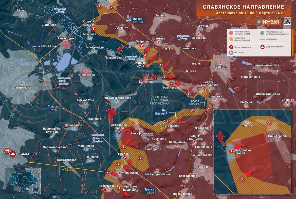 📝 На Славянском направлении подразделения группировки войск «Юг» продолжают наступление вдоль трассы М-03 в сторону Краматорска. Первые с 2014 года прилеты артиллерии по черте города говорят о постепенном приближении боев к городской агломерации. ➡️Присутствие российских штурмовиков зафиксировано на западной окраине Федоровки Второй, расположенной севернее Приволья. После занятия Липовки и соседней Дибровы бойцы смогут обходить укрепленные позиции в Рай-Александровке с фланга. Вместе с продвижением на северном фланге на рубеже Каленики — Кривая Лука это позволит взять оставшиеся в селе украинские формирования в «клещи». На текущий момент позиции ВСУ в Калениках подвергаются массированным артиллерийским ударам. ➡️При этом в самом Приволье обстановка длительное время остается скрытой «туманом войны». Окончательная зачистка села вместе с соседней Голубовкой позволит закрыть крупный «карман» восточнее населенных пунктов и высвободить дополнительные силы для продвижения к Тихоновке и Ма