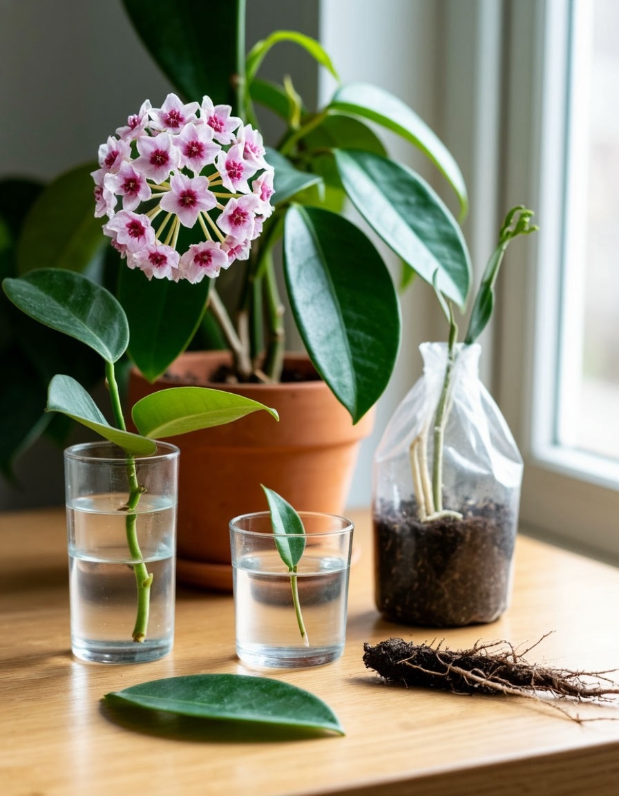 Хойя любит, чтобы корни были в тепле. Идеально — поставить ёмкости на тёплую подставку или батарею (не горячую!). Температура грунта +25…+28°C ускоряет корнеобразование в 2 раза.