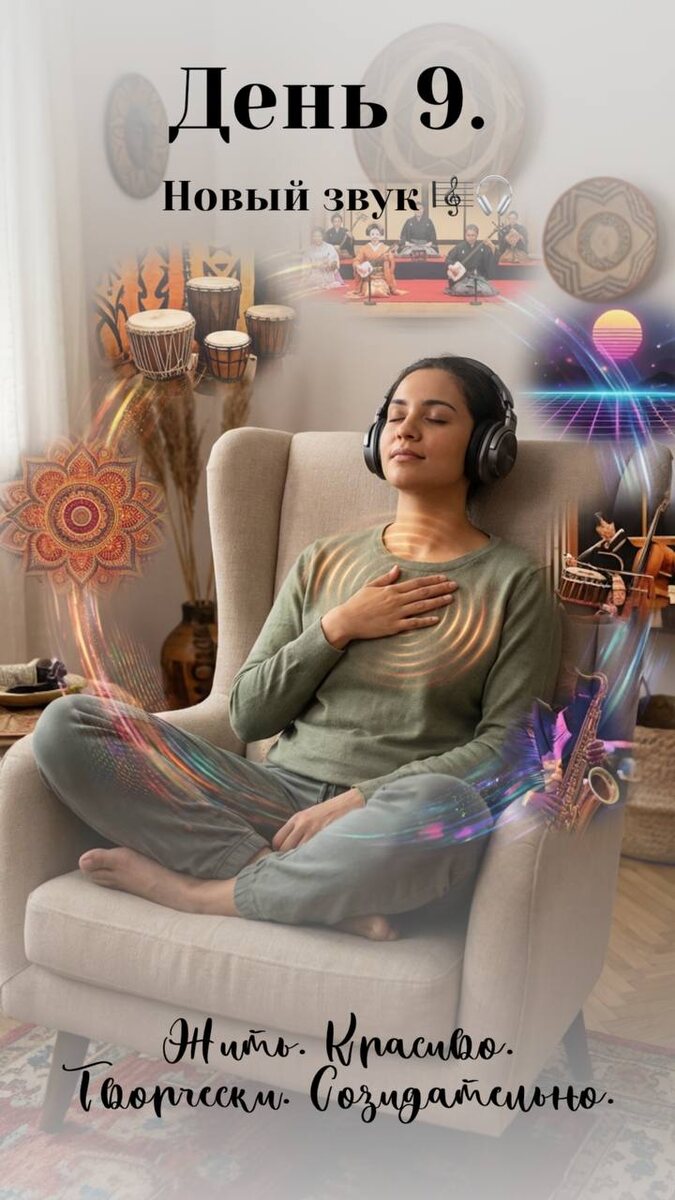 ✨ Практикум «Жить. Красиво. Творчески. Созидательно.» 🎨 Неделя 2: Творчество и поток (Хобби, обучение, вдохновение) День 9️⃣. Новый звук 🎼🎧 Сегодня мы исследуем мир через слух. 👂✨ Включи музыку, которую никогда раньше не слушал — другой жанр, другая культура, другое время. Японский традиционный оркестр, африканские барабаны, индийские раги, электроника 80-х, джаз, этника — всё, что не входит в твой обычный плейлист. 🎶🌍 А теперь — самое интересное. Закрой глаза и обрати внимание, в каких частях тела отзываются вибрации. Где живёт этот звук? В груди? В ногах? В затылке? Вызывает ли он мурашки, тепло, лёгкость? Это не просто музыкальное путешествие. Это практика расширения энергетического диапазона восприятия. Чем больше частот мы способны улавливать — тем объёмнее становится наша реальность. 📌 Рекомендации на путь: 1️⃣ Поделись с теми, кто дорог. ❤️ Делясь важным, мы не просто рассказываем — мы даём другим разрешение тоже быть чуткими к себе. Возможно, именно сегодня кому