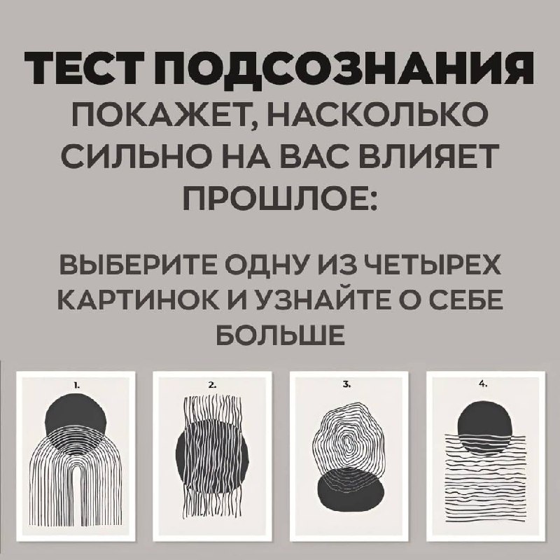 Не думайте долго, выберите интуитивно. Прочитайте описание вашего выбора👇 1️⃣ Вы выбрали картинку №1 • Суть: вы тянетесь к опоре и порядку; прошлое для вас — как прочный фундамент, на который вы опираетесь. • Как прошлое влияет: формирует ваши привычки, ценности и чувство безопасности; вы часто действуете по проверенным сценариям. 2️⃣ Вы выбрали картинку №2 • Суть: вы чувствуете влияние прошлого как сеть переживаний и эмоций, которые переплетаются с настоящим. • Как прошлое влияет: часто определяет эмоциональные реакции — вы чувствуете и реагируете глубже, иногда бессознательно. 3️⃣ Вы выбрали картинку №3 • Суть: прошлое воспринимается как слои опыта, которые формируют вашу идентичность — вы стремитесь понять себя целиком. • Как прошлое влияет: вы анализируете и переосмысливаете события, ищете смысл и связь. 4️⃣ Вы выбрали картинку №4 • Суть: прошлое словно скрыто под поверхностью — вы чувствуете его влияние, но оно не всегда ясно выражено. • Как прошлое влияет: подспудные установ