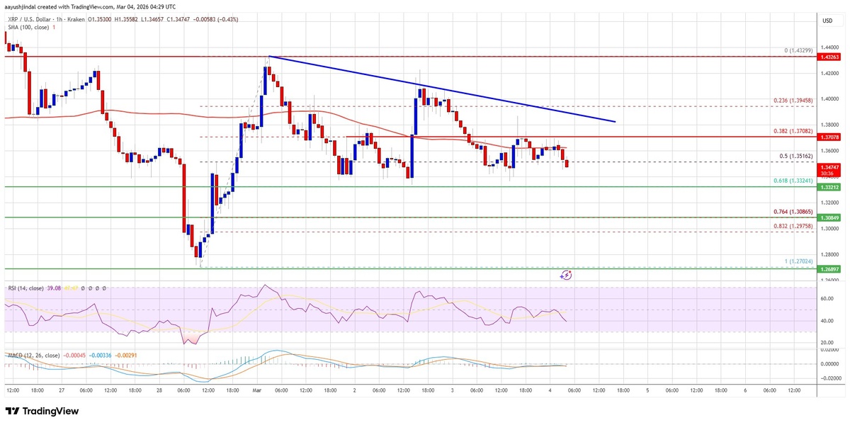 Цена XRP не смогла удержаться выше $1.420 и начала коррекцию, опускаясь ниже $1.380 и 100-часовой SMA. Сейчас XRP удерживает поддержку на уровне $1.3320, что может стать точкой для нового роста. Ключевое сопротивление находится на уровне $1.3880. 📊 Ключевые моменты: - Текущая цена торгуется ниже $1.3740 и 100-часовой простой скользящей средней. - Формируется новая медвежья линия тренда с сопротивлением на уровне $1.3880. - Восходящее движение столкнется с сопротивлением вблизи $1.370, далее $1.3880 и $1.40. - При пробое $1.40 возможно движение к $1.4320 и $1.450, далее к $1.50. - В случае снижения, поддержка находится на $1.3320 (61.8% Фибоначчи), затем $1.3085. - Прорыв ниже $1.3085 может привести к дальнейшему падению до $1.2880 и $1.2650.