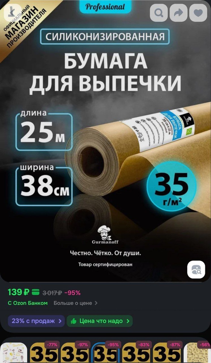 Бумага для выпечки силиконизированная 25 м (пергамент) в рулоне для выпекания за 139₽