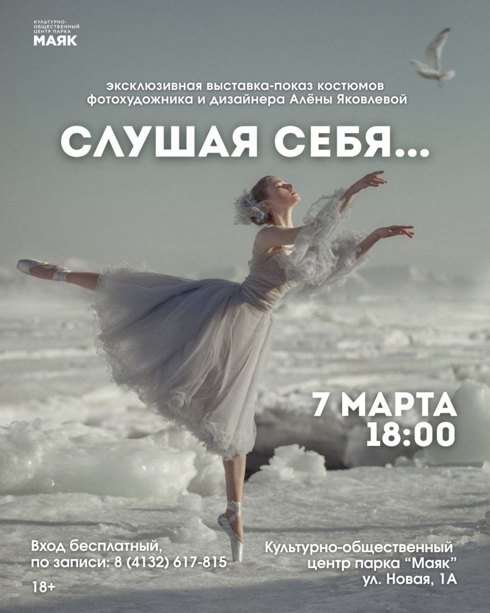 7 марта в 18:00 Культурный центр парка «Маяк» превратится в подиум, где главные роли исполнят изящество и стиль. Фотограф Алёна Яковлева, умеющая видеть прекрасное в женщинах через объектив, представит свое видение образов. Это будет эксклюзивная презентация костюмов, посвященных главной музе любого творца — Женщине. Утонченность линий, гармония цветов и вдохновение в каждой детали. Приходите насладиться эстетикой и зарядиться праздничным настроением! 📅 Дата: 7 марта | 18:00 🏛 Место: Культурно-общественный центр парка «Маяк», Новая 1А Обязательна запись по форме или по номеру 8 (4132) 617-815 Вход свободный,18+