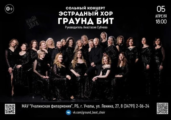 (0+) Концерт эстрадного хора «ГРАУНД БИТ» [club109160101|«ГРАУНД БИТ»] — это уникальный коллектив из города Челябинска. Коллектив является лауреатом Всероссийского конкурса «Битва хоров» и победителем многих международных вокальных конкурсов. Неповторимые голоса из любого произведения создают хоровые шедевры! Неподражаемая классика, народные и патриотические песни, а также давно полюбившиеся широкой аудитории хиты станут основой концерта. Каждый зритель обязательно найдёт песню близкую именно ему! Концерт хора «ГРАУНД БИТ» это уникальное вокальное шоу, наполненное теплом и искренней любовью к зрителям. Удивительная атмосфера праздника позволит насладиться прекрасным музыкальным вечером и зарядиться положительными эмоциями! Нач. 18:00 Билеты в продаже в кассе Учалинской филармонии, цена от 400 р. Касса работает в будние дни с 10:00 до 19:00, перерыв14:00-15:00 Справки по 8 347 912-06-24, 8 964 960-74-73… https://uchaly102.ru/?p=128028