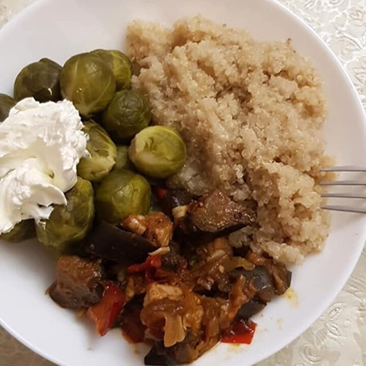 На 3-4 умеренных порции: ✔ Брюссельская капуста (замороженная или свежая) — 500 г; ✔ Вода для варки — сколько нужно для покрытия капусты. ✔ Киноа (сухая крупа) — 200 г; ✔ Вода — 400 мл (пропорция 1:2). Капусту, если замороженная, то не размораживать. Если свежая, то снять с кочерыжки, убрать тёмные места и жёлтые листочки, затем промыть. Выложить капусту в кастрюлю, залить водой так, чтобы она чуть покрывала капусту, и поставить на большой огонь. Варить замороженную брюссельскую капусту после закипания 12 минут, свежую - 5-7 минут. Проверить капусту на готовность: она должна быть мягкой при протыкании вилкой. Откинуть капусту на дуршлаг и дать стечь воде. КБЖУ на 100 г – 45/3,5/0,3/9,4 (из них ≈50% - пищевые волокна (клетчатка)). Киноа очень проста в приготовлении. Быстрее всего её сварить в кастрюле: залить водой 1:2, подогреть до закипания и варить 15 минут под крышкой при слабом кипении и периодическом помешивании. Солить не надо – киноа имеет слегка солоноватый вкус. КБЖУ на 100 г