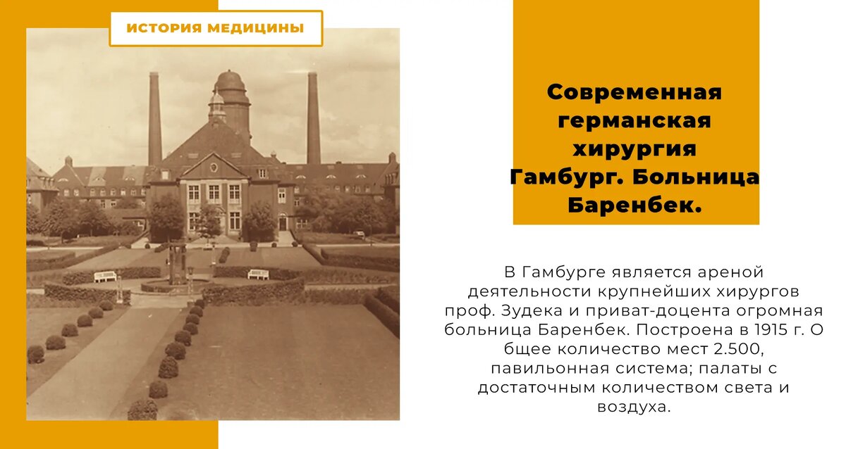 В текстах Брускина Гамбург всё время звучит как город больших масштабов. Но Баренбек выделяется даже на этом фоне: больница на 2 500 мест, построенная в 1915 году, павильонная система, много света и воздуха, зелень, цветы, ощущение нового мира, где медицина перестаёт быть «камерами» и становится пространством. Впечатление почти физическое: здесь больной должен выздоравливать уже тем, что вокруг него есть воздух. Павильонная логика простая. Палаты по 18 коек, плюс отдельные комнаты для тех, кому нужен покой. Операционный павильон — отдельное одноэтажное здание новой постройки, связанное с мужскими и женскими корпусами. Это не эстетика ради эстетики. Это попытка разнести потоки, снизить грязь, дать операционной автономию. Начало XX века ещё живёт страхом инфекции как реальности ежедневной, и правильное устройство больницы воспринимается как часть антисептики. В Баренбеке работают крупные фигуры — Зудек и Элекер. И Брускин фиксирует детали, которыми тогда гордились так же, как сейчас горд