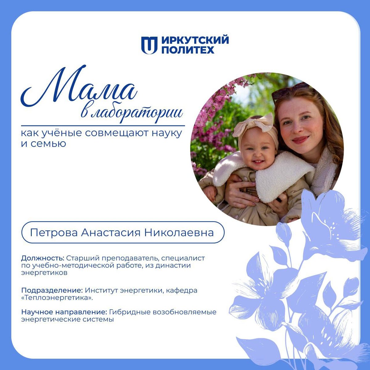 🌸 В преддверии Международного женского дня Минобрнауки запускает трогательный и вдохновляющий проект «Мама в лаборатории: как учёные совмещают науку и семью». Цель проекта — показать реальных героинь современной науки: исследовательниц, преподавателей и руководителей лабораторий, которые успевают не только делать открытия, но и растить детей. Гордимся, что одной из героинь проекта от Иркутского политеха стала Анастасия Петрова — старший преподаватель, специалист кафедры теплоэнергетики. У Анастасии две прекрасные доченьки (9 месяцев и 2,2 года). Для их семьи настоящим чудом стало то, что младшая дочь родилась 22 декабря — в День энергетика. Поскольку у Петровых династия энергетиков уже в трёх поколениях, рождение второго ребенка стало самым символичным подарком судьбы! Анастасия посвящает науке каждую свободную минуту, особенно когда дети спят. Но эти моменты тишины часто бывают недолгими: стоит открыть ноутбук и погрузиться в работу, как уже через пять минут из детской раздается
