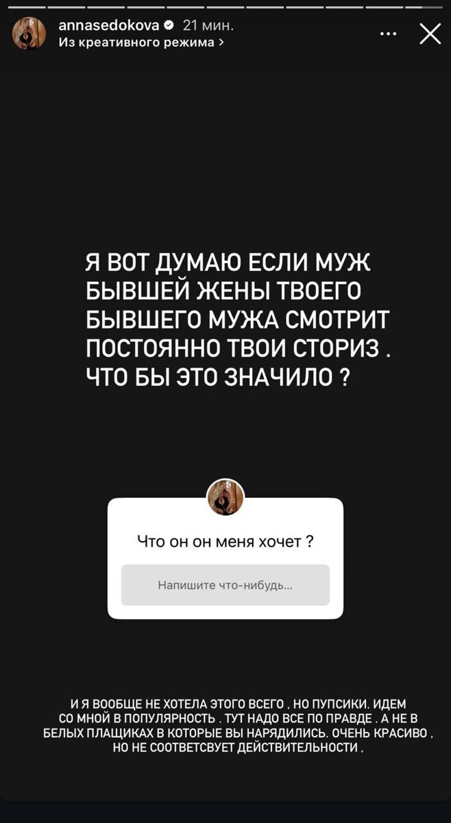 В серии путанных ночных сторис Анна Седокова поведала, что больше всего отсудить у неё денежки Яниса Тиммы хочет новый муж его бывшей жены. Даже не бывшая жена. И даже не родители. А все потому что этот чувак из Латвии, футболист Марцис Ошс постоянно смотрит её сторис, вот нахал! А еще живет в квартире, которую Янис оставил сыну. И ездит на его бывшей машине. А Яниса даже к сыночку не пускал. Но делиться деньгами и имуществом Седокова не намерена. Тем более, что Янис ничего не заработал, всё на ней держалось. - На каждое слово у меня есть бумажка. Встретимся в суде, мои жадные бездельники! - пригрозила Седокова и посоветовала всем жадинам наконец начать работать, как она, с 14 лет и каждый день